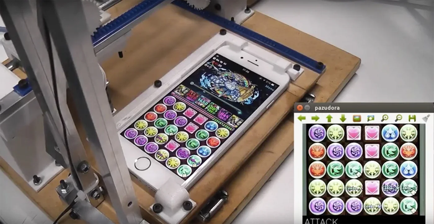 YouTube user Junya Sakamoto has developed a robot that can play the popular Japanese puzzle game Puzzle & Dragons for him (shuffling coloured orbs to match up, just like the aforementioned game) with ridiculous speed and accuracy. A connected laptop analyses the board and picks out any optimum combos, setting off a fast set of moves at a speed you can't possibly match.