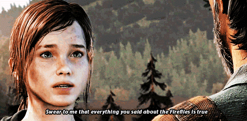 “Swear to me.” She proclaims, exasperated by Joel’s subsequent dodging of any real topic here. “Swear to me that everything you said about the fireflies, my Dad and Jackson is true.”